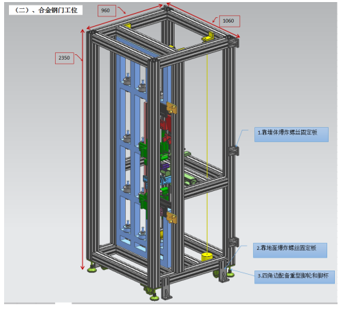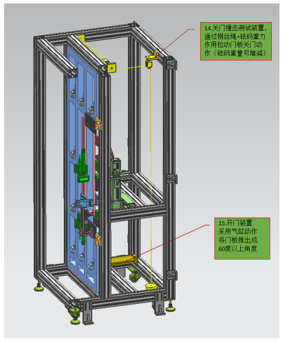 結構上采用(yòng)加厚80*80鋼材材焊接而成,框架穩固可靠,結構美觀大體,配備(bèi)腳輪腳杯,方便(biàn)移動定位。考慮到門的撞擊測試的振動性影(yǐng)響,將機台進行了分體設計,即工位之間的(de)完全獨(dú)立性,同時控製(zhì)櫃也分離設計,所以機台分為兩個主機工位體(tǐ)和一個(gè)控(kòng)製櫃體(tǐ),有(yǒu)效克服了工位(wèi)之間的撞(zhuàng)擊振動的相互影響,以及振動對電子元器(qì)件的壽命損傷。采用合金鋼門體,門體采用焊接設計,同時均勻化了增減砝碼的重量;或采用真甲級防盜門體+門框設計,接近鎖體的真實使(shǐ)用性。