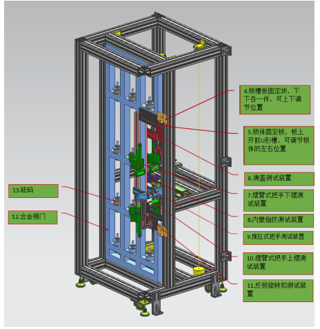 智能門(mén)鎖綜合壽命試驗機試驗機(jī)適用於多種類型智能電(diàn)子鎖進行壽命測試,配備適(shì)用性強的固定(dìng)夾具、指紋測(cè)試裝(zhuāng)置、刷卡測試(shì)裝置,滑蓋測試裝置,門把手(shǒu)測試裝置,門衝擊力測試裝置等。