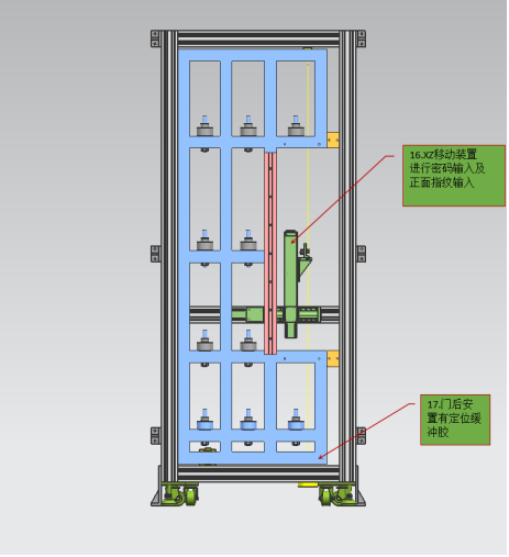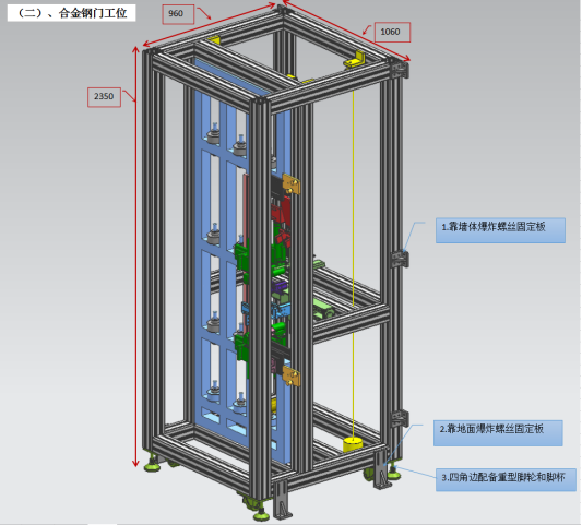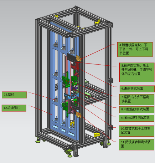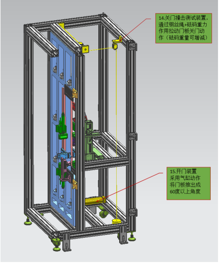 結構上采(cǎi)用加厚80*80鋼(gāng)材材(cái)焊接而成,框架穩固可靠,結構美觀大體(tǐ),配備腳輪腳(jiǎo)杯,方便移動定位。考慮到門的撞擊測試的振動性影響,將(jiāng)機(jī)台進行了分體(tǐ)設計,即工位之間的完全獨立性(xìng),同時控製櫃也分離設計,所以機台分為兩個主機(jī)工位體和一(yī)個控製櫃體,有效克服了工位之間的撞擊振動的相互影響,以(yǐ)及振動對電子元器件的壽命損傷(shāng)。采(cǎi)用合金鋼門(mén)體,門體采用焊(hàn)接設計,同時均勻化了增減砝碼的重量;或采用真甲級防盜門體+門框設(shè)計,接近鎖體的真實使用性。