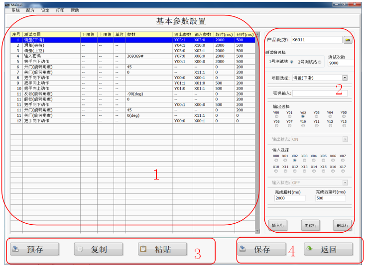 複製 粘貼 :點擊此鍵(jiàn),即可(kě)將基本測試參數裏的測試步驟全部複(fù)製,切換到另一個工位時,點擊下粘貼,即可將之前(qián)工位的測試參數複製到當前工位裏麵來,這樣可以簡(jiǎn)化編程(chéng)過程